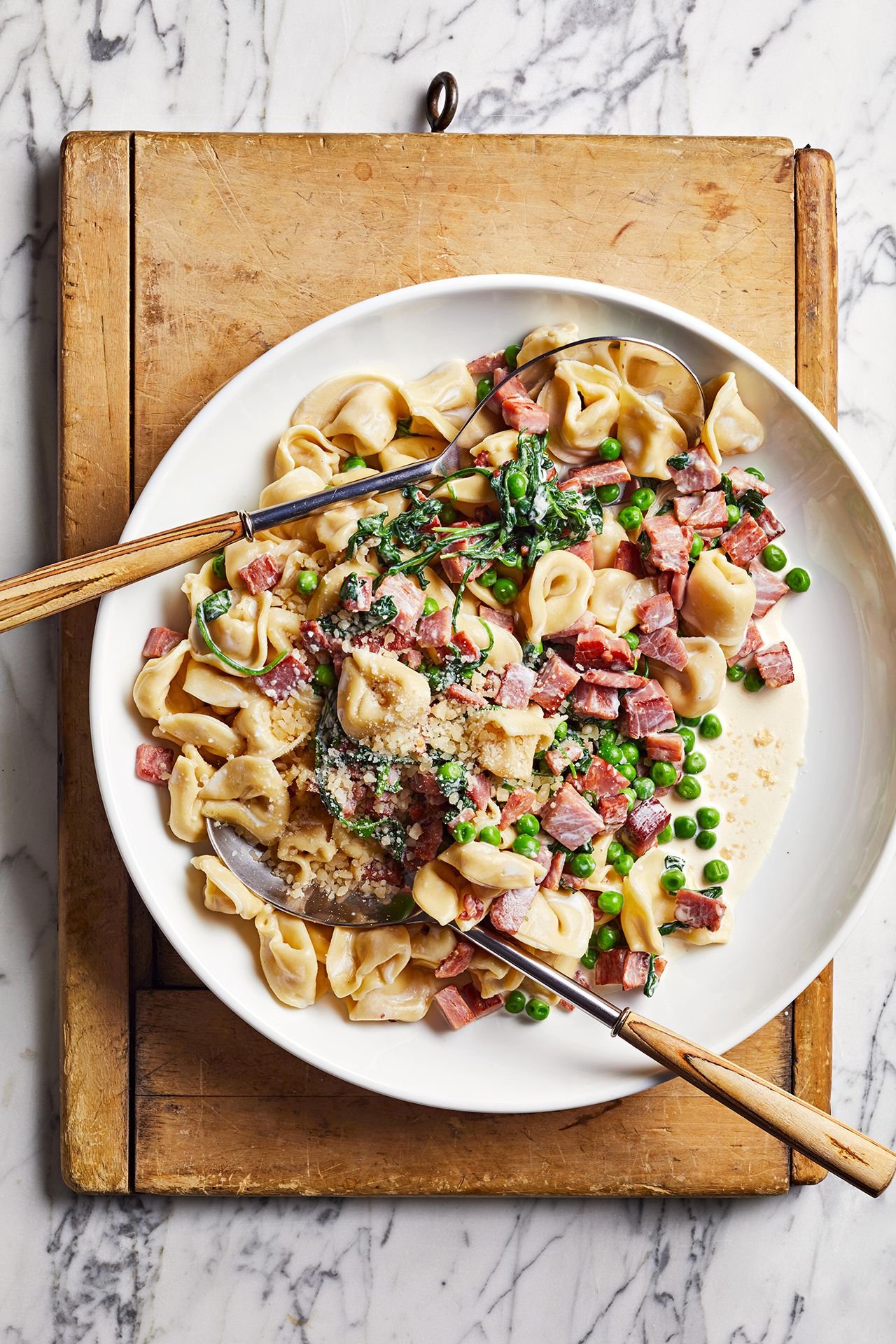 Here’s the best dinner made with 7 ingredients. The recipe requires only 10 minutes because it uses refrigerated cheese tortellini and cooked ham. I added a few handfuls of fresh arugula and peas to make it a balanced meal. And don’t forget to top with extra Parmesan cheese.