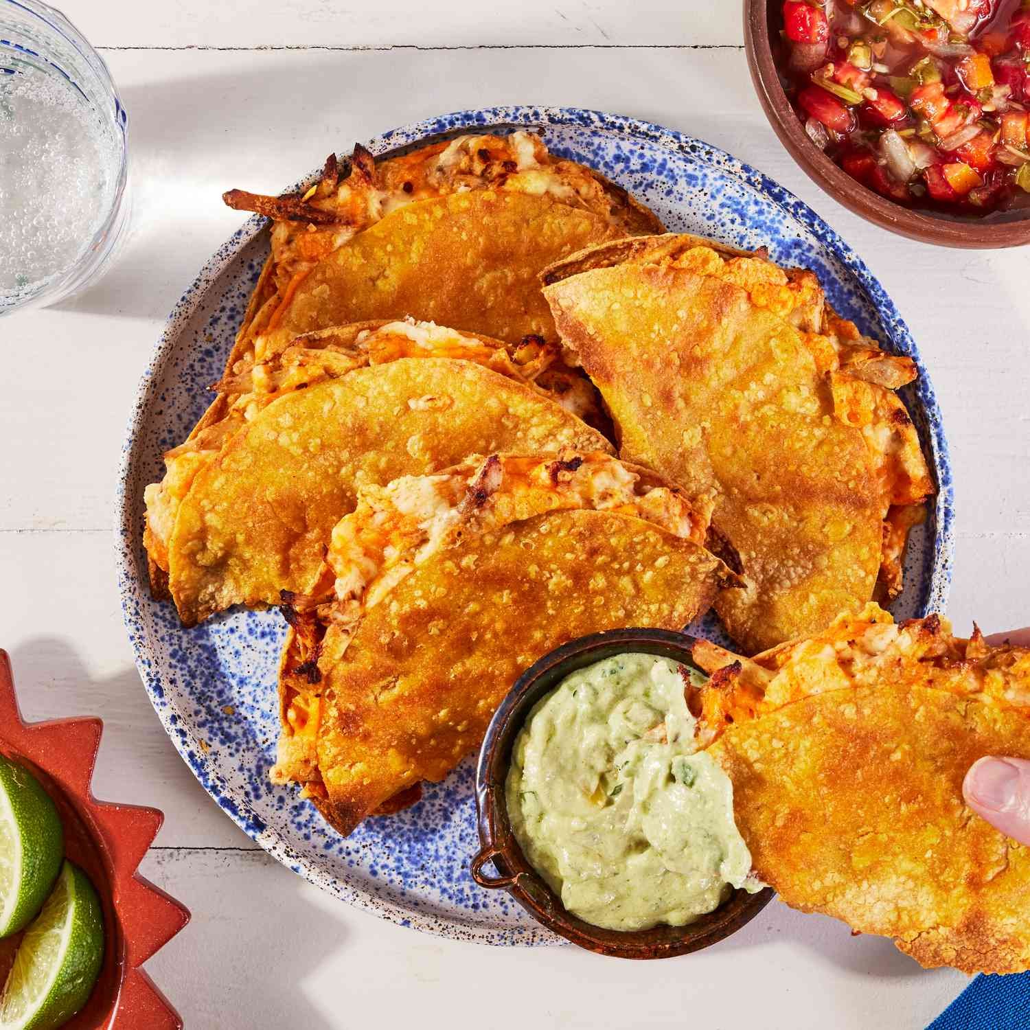 These crispy chicken tacos are packed into a baking pan and baked so they’re crunchy on the outside and warm and melty inside. The creamy avocado and fresh cilantro make a great garnish. Don’t overcrowd the tacos onto one baking pan; giving them enough space will help them crisp up better. Rotate baking pans halfway through cooking to ensure even cooking.