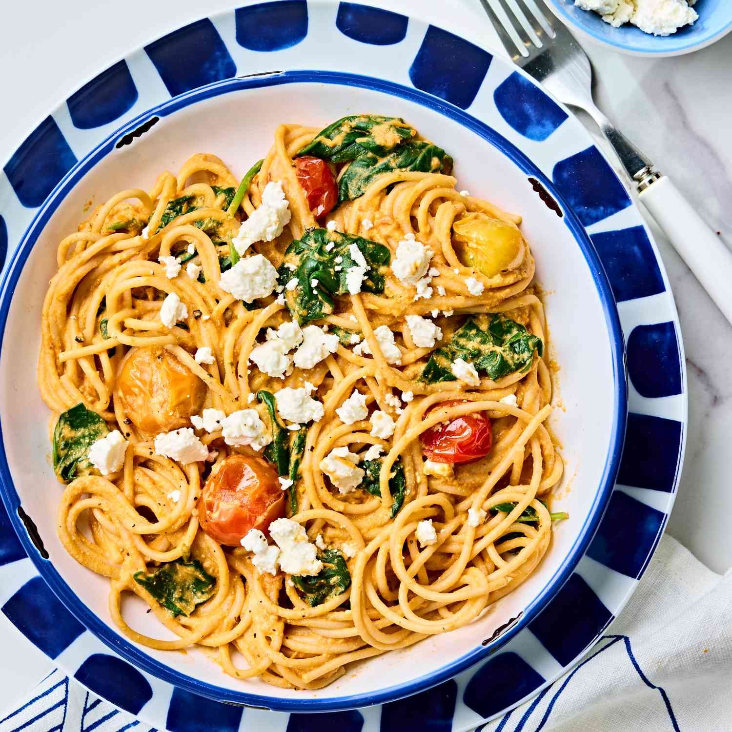 This creamy feta and tomato pasta uses just five simple ingredients to bring a satisfying vegetarian dinner to your table. Cherry tomatoes are your go-to when tomato season isn’t at its peak. Grape tomatoes make a sweet and juicy alternative that guarantees a satisfying and flavorful meal.