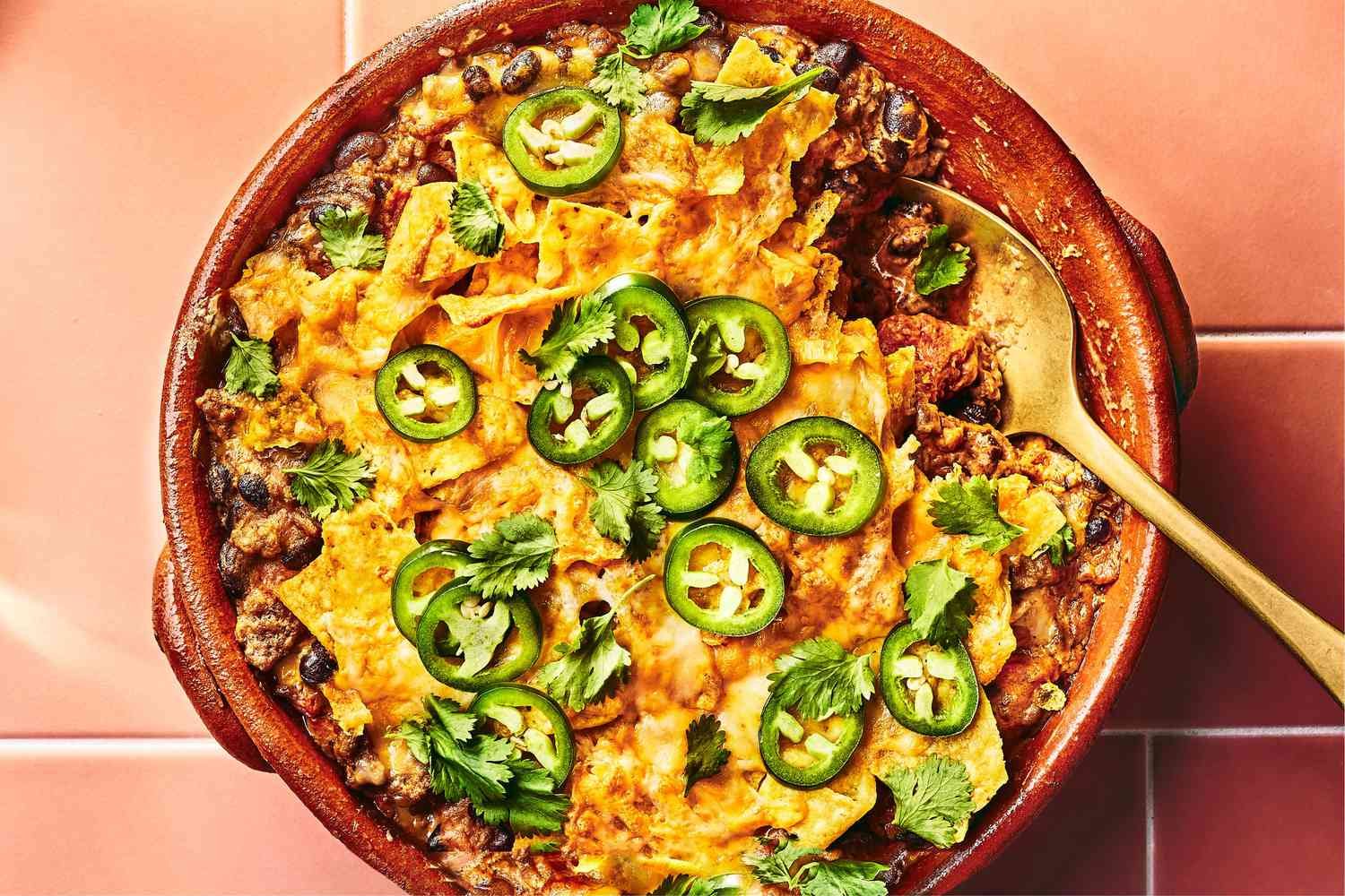 This layered dish is a great way to feed a crowd on a budget and requires less than 10 ingredients. A solid base of ground beef, canned black beans, and canned diced tomatoes is complemented by cream cheese, shredded Colby Jack, and taco seasoning. Top that layer with tortilla chips and more cheese. If you want garnishes, choose jalapeño slices and fresh cilantro.
