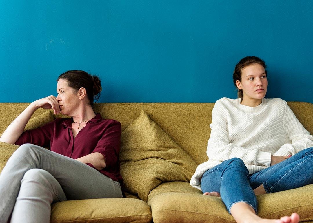 An adult and a young person sit on opposite sides of a yellow sofa, gazing into the distance in front of a blue wall.