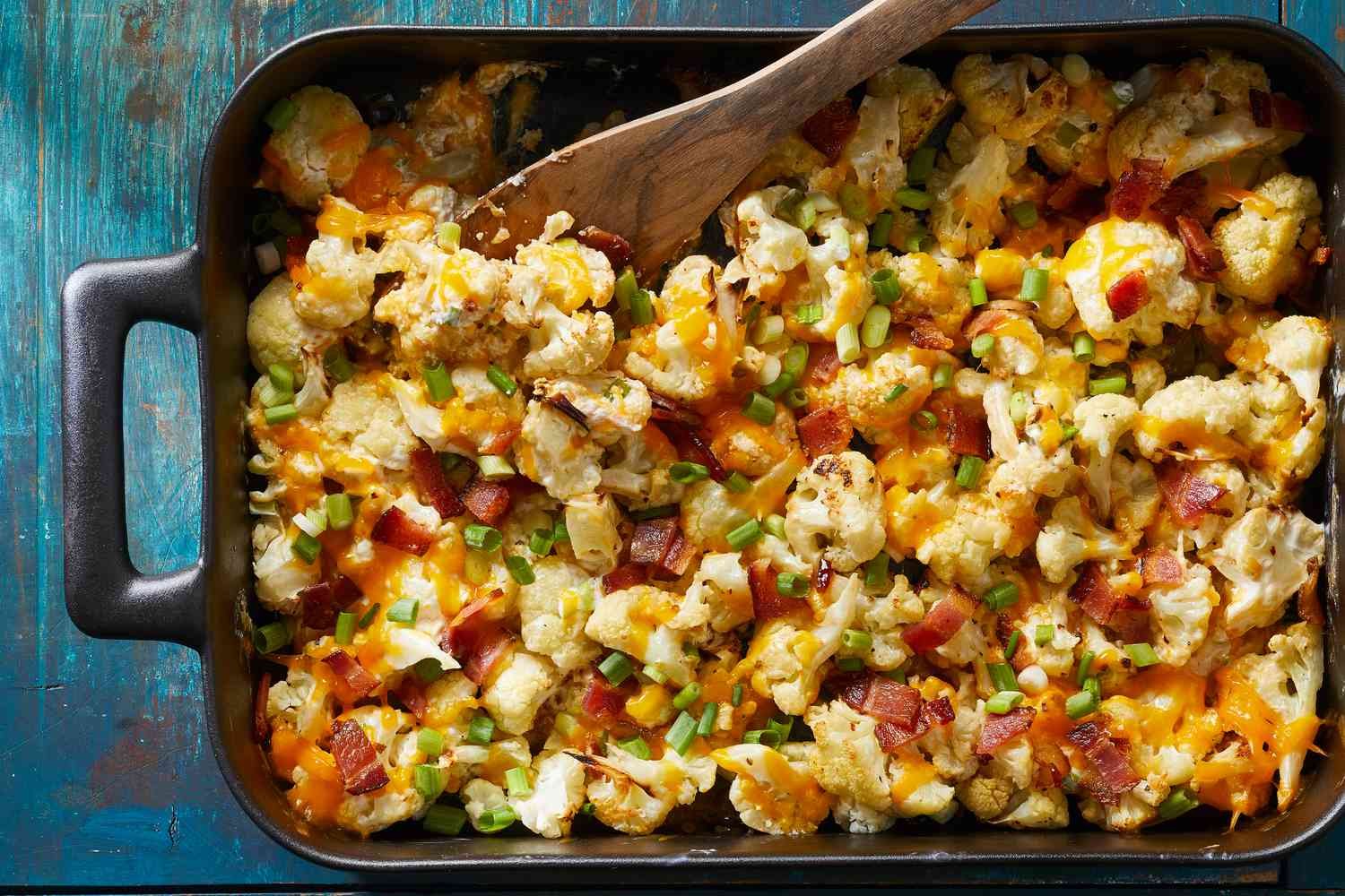 Once you try this delicious recipe, you’ll never want to eat roasted cauliflower any other way. Bacon, sour cream, and sharp cheddar cheese envelope the wholesome cauliflower in a delicious, easy side dish that’ll get everyone craving their veggies.