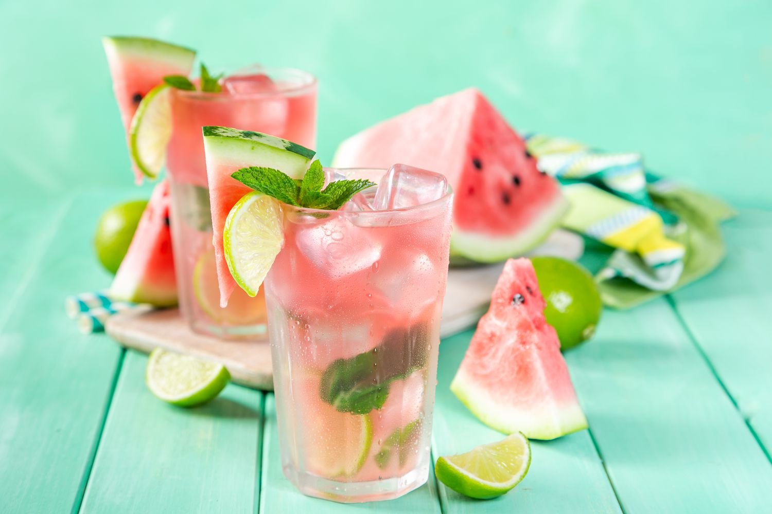 This super easy drink only requires two ingredients: watermelon and store-bought lemonade. First, cube the watermelon and liquor it in a blender. Next, pour the watermelon puree through a fine strainer to remove any lumps or grains. Mix the strained watermelon puree with the lemonade (one tablespoon each) and pour over ice for a quick and refreshing drink. If you want to get fancy, garnish with mint sprigs and lemon or lime slices.