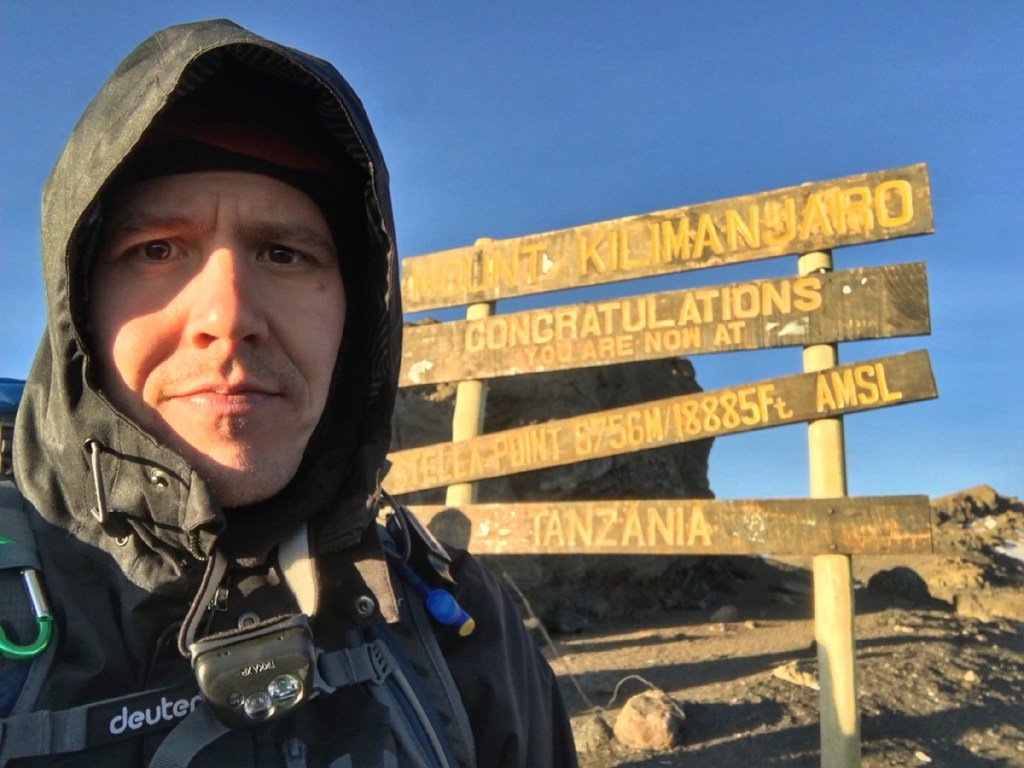 Jeff Belanger takes a selfie at Stella Point, the volcanic rim of Mount Kilimanjaro. This is the last stop before the summit. (Courtesy of Jeff Belanger)