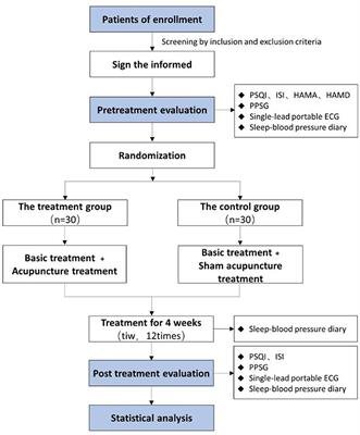 The calculation of sample size will be based on the change of ISI scores. According to the results of existing published literature (36), the overall standard deviation of ISI scores in patients of hypertension with insomnia was 5.5, ISI scores decreased by 3.3 after treatment, α = 0.05, β = 0.10, and N ≈ 24 cases were calculated. Considering the factors of contamination, non-compliance and shedding during the test, the shedding rate was determined to be 20%, so there were 30 cases in the treatment group and 30 cases in the control group. For comprehensive consideration, a total of 60 samples will be required for this study.