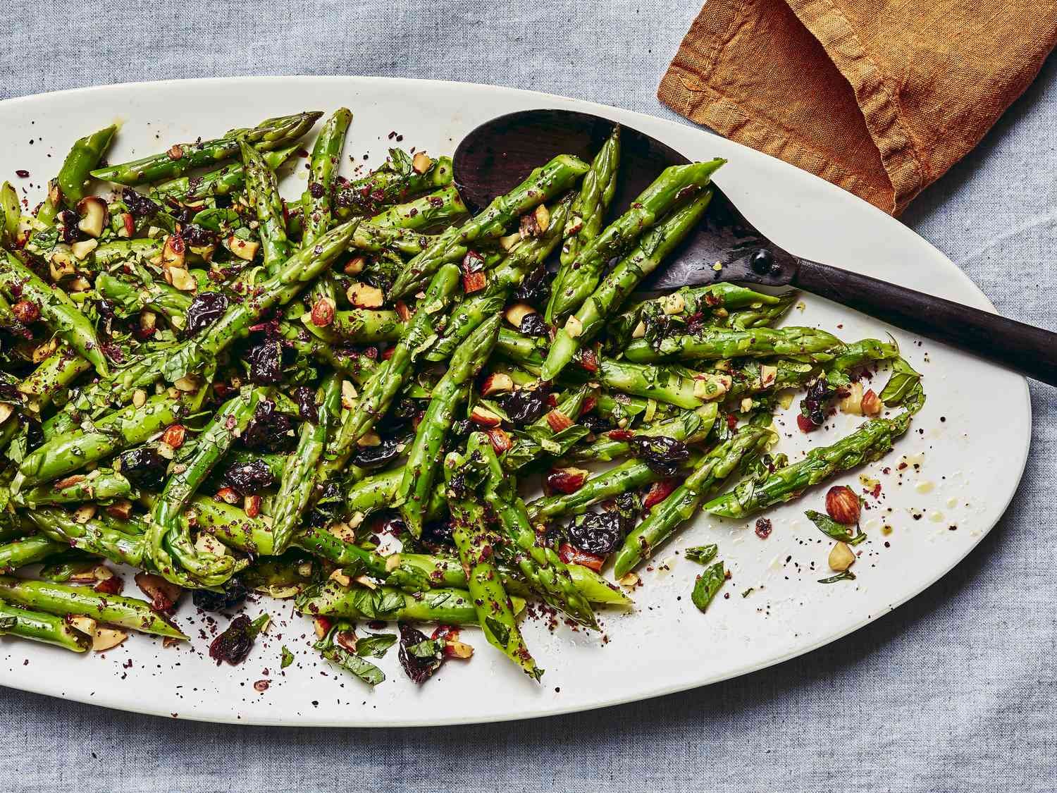 This quick and easy recipe has all the flavors of spring. Fresh asparagus spears are blanched and tossed with a blend of tangy sumac, tangy black pepper, and buttery extra virgin olive oil. A refreshing gremolata of sharp dried cherries, crunchy almonds, parsley and mint, sprinkled with lemon zest for a citrusy note, makes this dish a simple and elegant addition to any spring table.