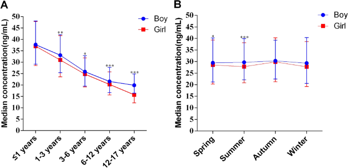 The present study has notable strengths, collecting serum 25(OH)D from 11,116 children aged 0–17 years in Wujiang District, Suzhou City, southeastern China, from 2020 to 2023, providing a substantial sample size. Furthermore, we assessed vitamin D levels across different age groups (0–17 years), providing valuable insights into serum 25(OH)D status based on various factors such as gender, age, season, and province in this region. However, it is important to acknowledge that the present study has some limitations. We did not extensively capture children’s sociodemographic characteristics and lifestyle factors that may affect serum 25(OH)D concentrations, such as vitamin D supplementation, time spent in outdoor activities, and BMI. Nevertheless, the study population consisted of 11,116 children undergoing regular health checkups at the hospital, increasing the representativeness of participants in the local child population. Further studies are needed to explore potential factors and variables associated with vitamin D status.41.