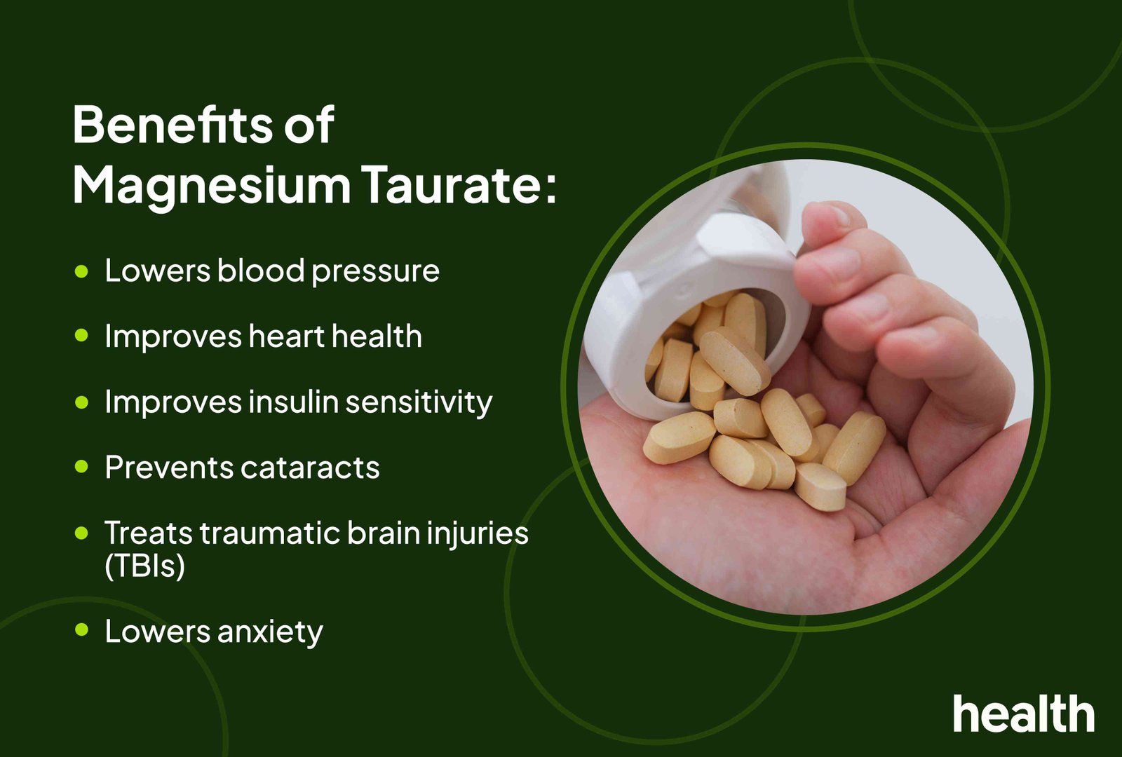 There is some evidence that magnesium taurate can help treat a variety of health conditions, including high blood pressure (hypertension), cataracts, diabetes, and anxiety. It also helps protect your eyes, heart, and overall brain health. However, research on the benefits of magnesium taurine is limited and ongoing.