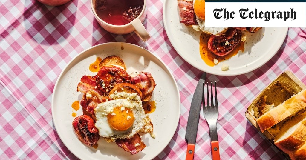 - Spread garlic mayonnaise on brioche and top with bacon, half of a tomato, and one egg. You might want to put more mayonnaise on top of the bacon.