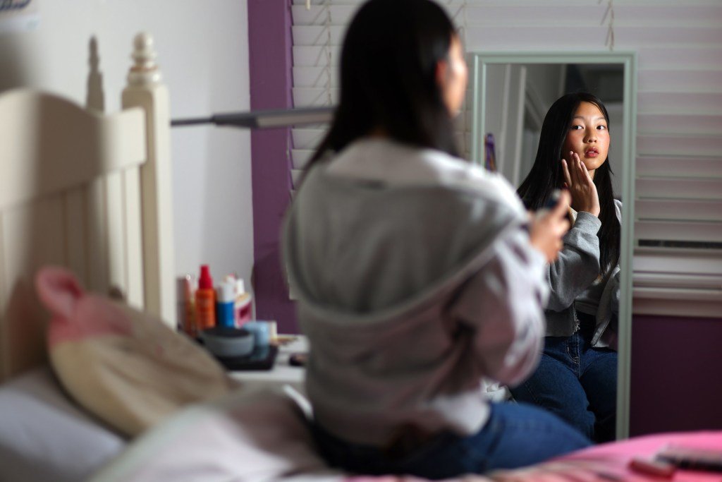 Emily Chan applies lotion in her room on Sunday, May 5, 2024 in Palo Alto, California. Emily Chan and her mother Carol are sponsoring a state bill that could ban the sale of anti-aging cosmetics to children under 13. Aric Crabb/Bay Area News Group)