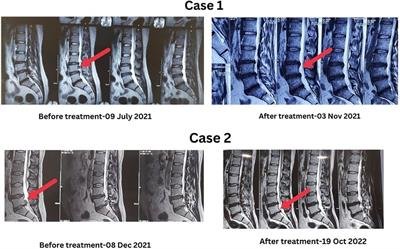 In response to these limitations, Integrated Naturopathy and Yoga (INY) emerge as a promising alternative. INY represents a non-surgical system of medicine that adopts a holistic and patient-centric approach to healing diseases (10). This approach incorporates a range of treatment modalities including counseling, manipulative therapy, hydrotherapy, therapeutic fasting, diet therapy, yoga therapy, heliotherapy, physiotherapy, acupressure, and acupuncture (11). Such a comprehensive method has not only demonstrated promising effects in alleviating pain and enhancing the functional quality of life in other musculoskeletal disorders but has also shown efficacy in comparison to physical therapy for managing non-specific low back pain (11–13). However, the available evidence on the effectiveness of INY in the management of sequestered LDH is currently limited. This prompted the presentation of two cases of sequestered LDH managed with INY in this study. The inclusion of INY in the management of sequestered LDH, therefore, offers a novel avenue for treatment that potentially mitigates the necessity for surgical interventions and aligns with the growing emphasis on holistic, patient-centered care.