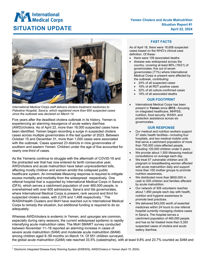 Cholera and Acute Malnutrition Situation Report #1 in Yemen – April 22, 2024 – Yemen
