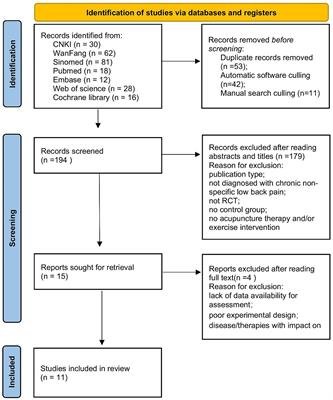 We identified 247 studies from the selected databases, with 53 duplicate entries removed by document management software and manual searches. The remaining 194 studies were screened using titles and abstracts to exclude 179. The remaining 15 studies were assessed based on the inclusion and exclusion criteria described above. We selected 11 RCTs for meta-analysis (19–29). A flowchart is shown in Figure 1.