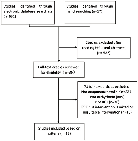 RCTs were included with blind method or not and without language restriction. Trials were included if they enrolled patients with various types of cardiac arrhythmia and randomly allocated patients to receive acupuncture treatment or commonly used clinical treatments. Studies were excluded if they meet any of the following conditions: (1) Post-hoc analysis or studies without reliable outcome data; (2) Non-randomized controlled trials; (3) Auricular needling or ear acupuncture were chosen.
