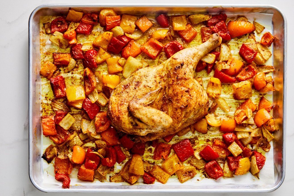 Half chickens, cut between the breast and back meat, are sold at most supermarkets and are a great way to cook for one person. They come in both white and lean meat, are on the bone and are juicy. They take less time to cook than a whole chicken, making them enough for two meals or a hearty dinner. Here, the curried chicken is roasted with peppers and onions, giving the pan juices a natural sweetness. They’re delicious served over rice or bread, or leftover chicken can be simmered in coconut milk for a curry stew, or shredded and tossed with mayonnaise for a chicken salad sandwich.