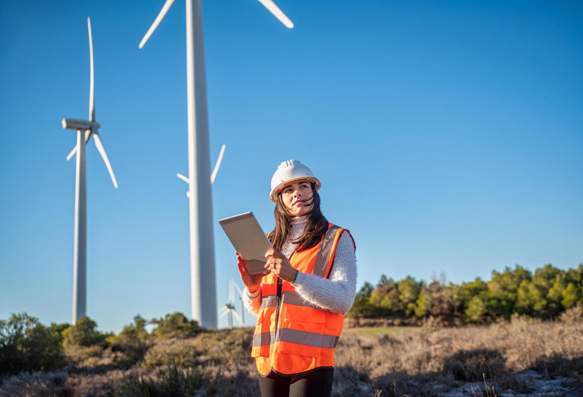 Windmills on farm, clean energy caucasian woman typing on digital tablet, power generation by wind turbines in Spain. Female engineers in renewable power, agricultural environment and safety equipment.Clear blue sky copy space