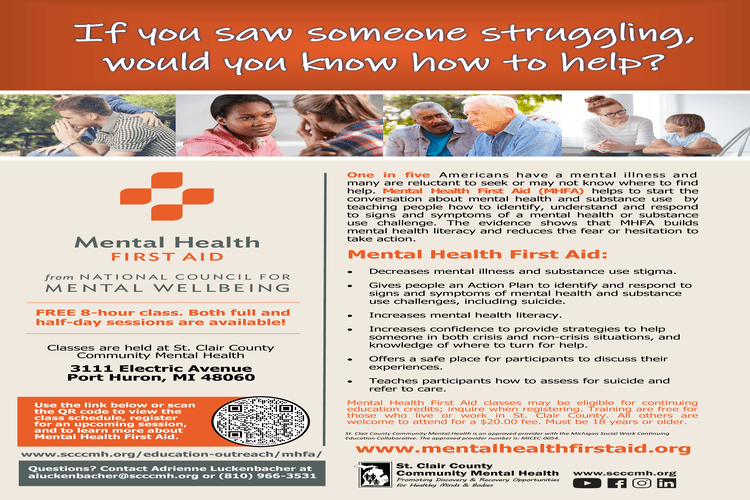 SCCCMH offers free Mental Health First Aid (MHFA) training to St. Clair County residents. MHFA helps start conversations about mental health and substance use by teaching people how to identify, understand and address signs and symptoms of mental health and substance use issues. Research shows that people who receive MHFA training have less fear and hesitation to take action and experience less stigma. For more information about MHFA or to register for upcoming presentations, visit: Mental Health First Aid – St. Clair County Community Mental Health (scccmh.org).
