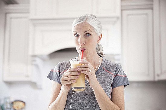 Photo of a mature woman drinking a protein shake through a straw in her kitchen