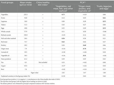 The PCA with varimax rotation was used to extract the population-specific dietary patterns from 17 food groups. The analysis was tested using the Bartlett test of sphericity (p < 0.0001) and the Kaiser–Mayer–Olkin test (0.64, Supplementary Table S1). The dietary patterns with an eigenvalue ≥1.5 were extracted. The factor loadings reflect the magnitude of the relation between food groups and dietary patterns. The adherence score for each dietary pattern was calculated by the intake of each food group and the corresponding factor loadings. The CHDI was previously validated (36). The food intake was converted to per 1,000 kcal for scoring. The CHDI contains 13 items, including food variety, whole grain, refined grain, total vegetables, dark green and orange vegetables, dry bean and tuber, soybean, fruit, fish, dairy, meat and egg, shellfish and mollusk, sodium and empty calories, and calories from solid fats (SoFAS). The CHDI score ranges from 0 to 100. A higher score indicated a higher diet quality.
