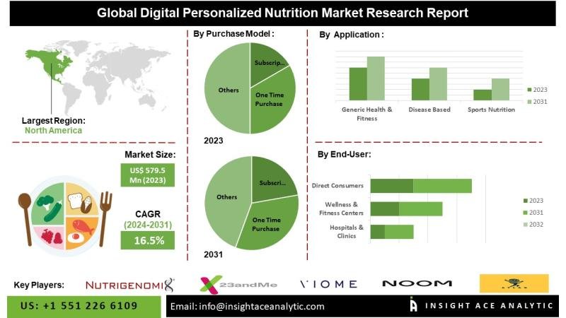 InsightAce Analytic Pvt. Ltd. is a global digital personalized nutrition market – (by purchase model (subscription, one-time purchase), by end user (direct-to-consumer, wellness & fitness centres, hospitals & clinics, institutions)). announced the release of a market assessment report on , by application (general health and fitness, disease-based, sports nutrition)), trends, industry competitive analysis, revenue and forecast to 2031.