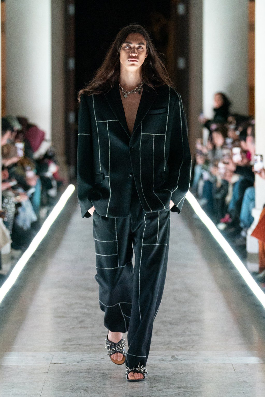 The show is both genuinely frightening — an army green hoodie with a flared hood lined with blood-red fluff reminiscent of Stranger Things’ Demogorgon monster — and hilarious. -A trench coat with two large bolts sticking out of the collar, or a jumbo hoodie that declares a nap instead of a gap.