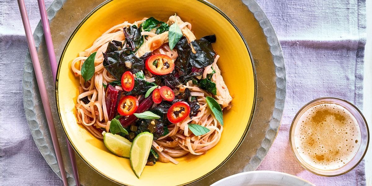 - Steps FiveRemove the pan or wok from the heat and stir in the basil leaves. Serve with the chilli, lime slices and a squeeze of lime.