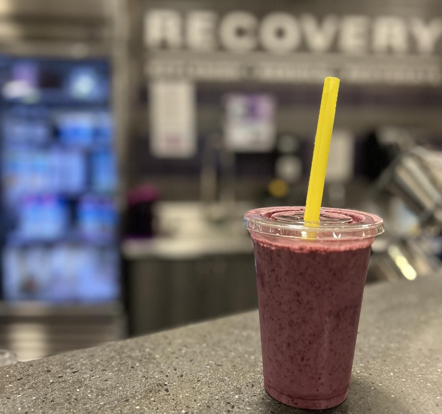Considering athletes’ busy schedules, convenience is an important factor for nutritionists to consider. The Ed & Ray Schollmeyer Arena weight room features a refueling station with smoothies, acai bowls, and other snacks so athletes can lift, recover, and head straight to class.