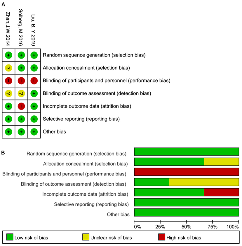 Among the three studies included in this review, all had random sequence generation, Liu et al. and Solberg et al. reported concealment of allocation (25, 27), Zhan et al.’s study (26) did not report how allocation concealment was done. None of the studies (25–27) blinded subjects in consequence of open-label trials which compared acupuncture with drugs, PFMT or no intervention, while Liu et al.’s study (25) reported blinding of outcome evaluators. Solberg et al.’s study (27) had high risk of attrition bias as its dropout rate was >40% and did not report how the missing data was dealt with. There was no reporting bias or other bias identified in any of the studies. Risk of bias assessment is presented in Figure 2.