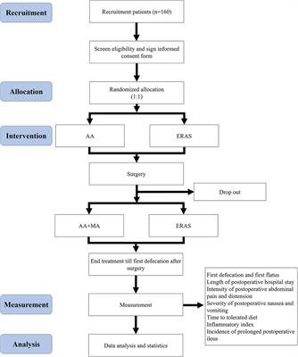The control group will receive regular treatment of ERAS 3 days before surgery because patients are always admitted to the hospital several days earlier for standard preoperative blood testing and bowel preparation, including taking oral anti-inflammatory drugs, having liquid food 72 h before the operation, accepting enema 24 h before the operation, using intravenous antibiotics to preventing infection, and so on. In addition, the control group will be initiated on a liquid diet within 24 h after surgery to stimulate bowel movement.