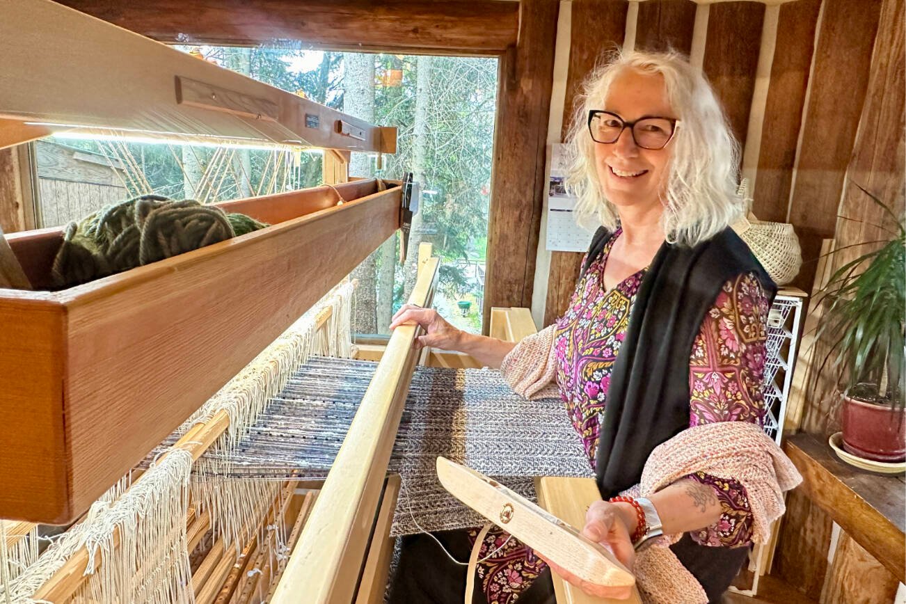 In her 30s, Banks mastered the craft and apprenticed with a master weaver for a year. She previously owned a clothing store in California, where she designed and sewed clothes, and later ran a furniture reupholstering business in Homer. Inspired by the changing colors, light and textures of the seasons, weaving has become a mindfulness practice for her.