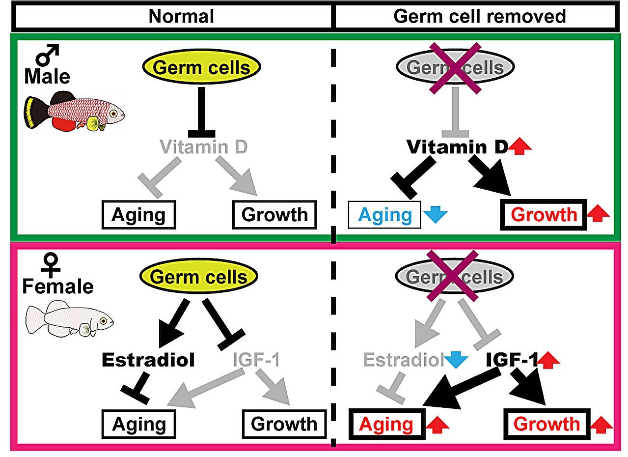 In contrast, male killifish, which lack germ cells, had improved muscle, skin and bone health. Interestingly, these fish had increased amounts of a substance that activates vitamin D, and there was also evidence of vitamin D signaling in muscles and skin.
