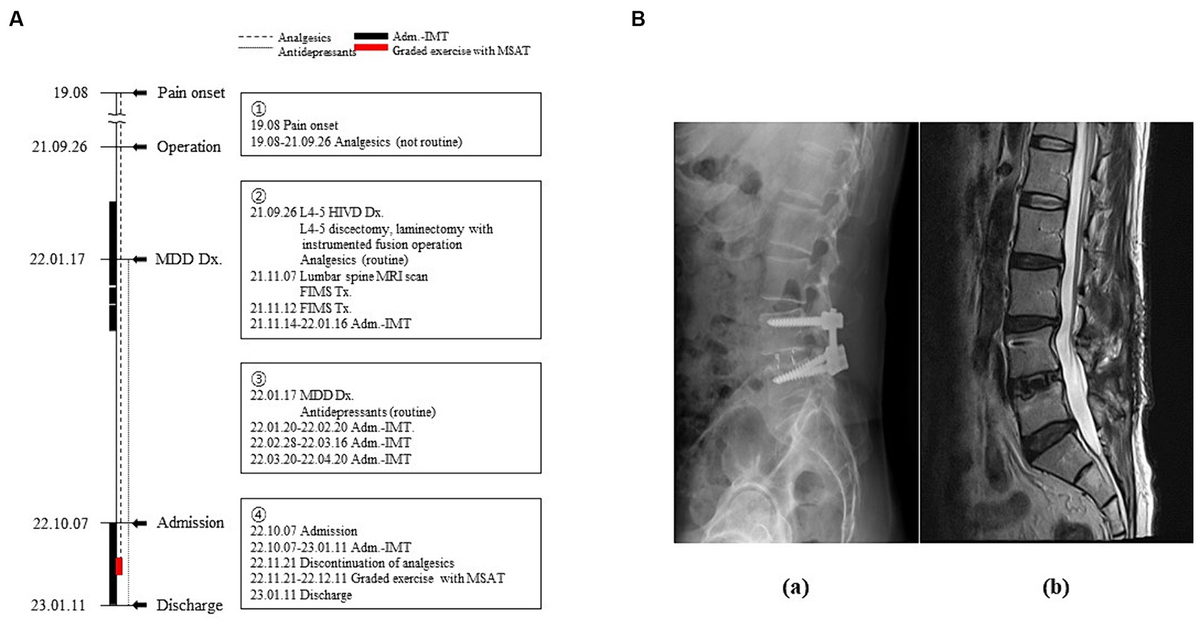 Figure 1. Timeline of the patient’s medical history. (A) Timeline of the medical events between the onset of the pain and the current treatment period. Narrative demonstrations of the timeline are in the boxes. (B) Radiological images of the lumbar spine (a: lateral view of X-ray image, b: Sagittal section of T2-weighted magnetic resonance image). Adm, admission; Dx, diagnosis; FIMS, functional intramuscular stimulation; HIVD, herniated intervertebral disc; IMT, integrative medicine treatment; MDD, major depressive disorder; MRI, magnetic resonance imaging; MSAT, motions style acupuncture therapy; Tx, treatment.
