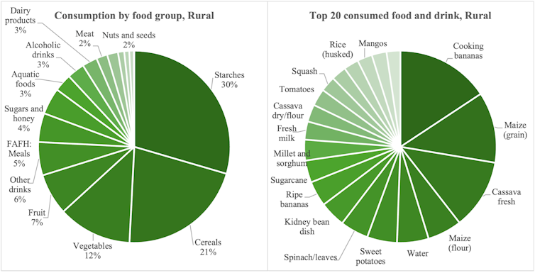The most consumed food items in rural areas were plantains, maize, cassava, sweet potatoes, and spinach.