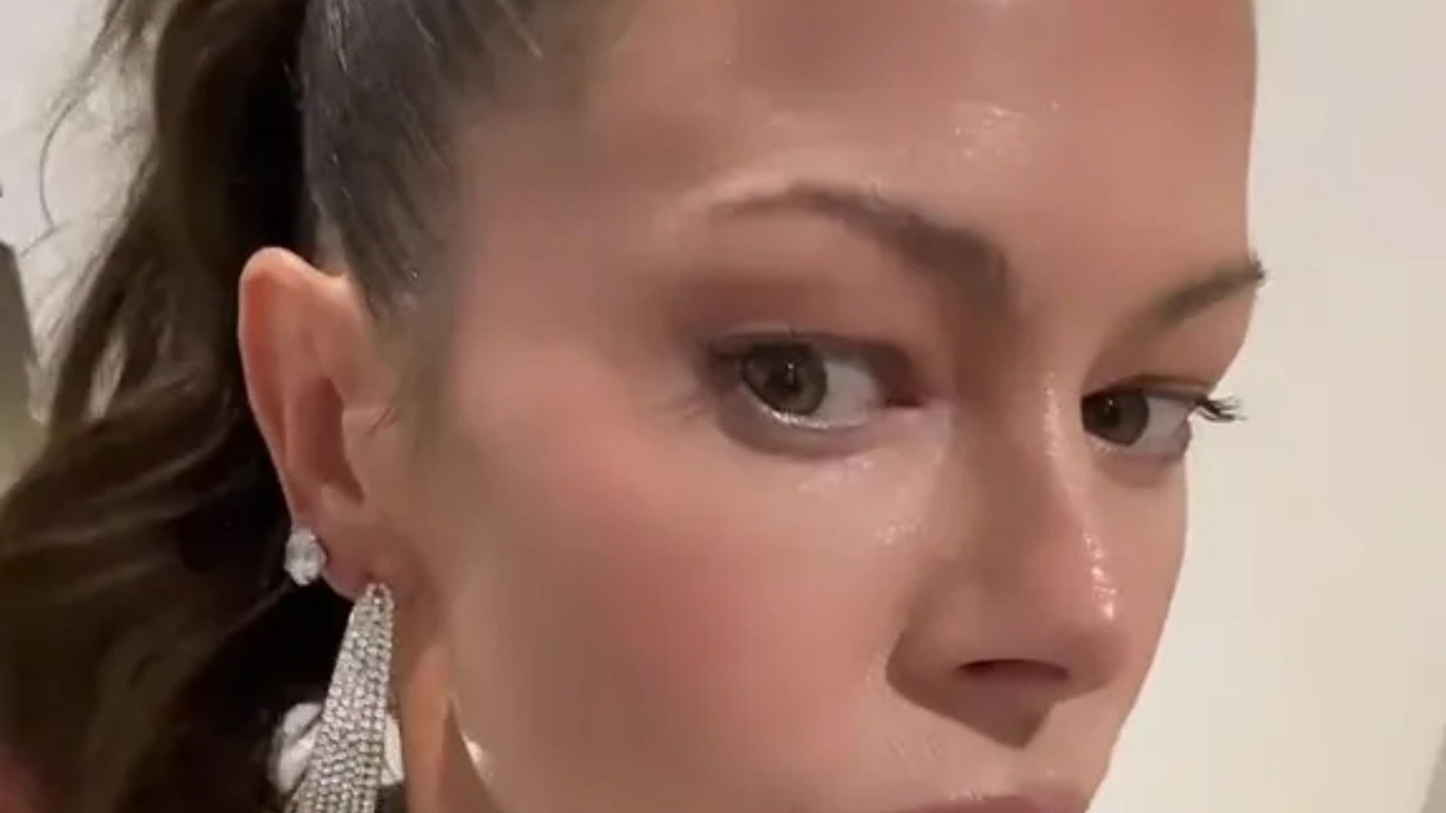 In a video shared to TikTok (@kristina.maay), she was seen tearing her hair behind her face, revealing her glassy skin.