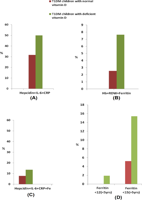 Our results suggested that the mean hepcidin levels were not significantly different between the two groups studied, but some children with insufficient VD had a higher rate of hepcidin elevation than those with sufficient VD, a behavior that has been observed previously.23,24,25Hepcidin is a systemic regulator of iron homeostasis. It is produced in response to iron stimuli and inflammatory conditions. Its role is to sequester iron in intracellular pools, reduce its gastrointestinal absorption, and reduce serum iron, a beneficial defense mechanism that masks iron use by bacteria.twenty oneIn this study, no significant difference in the mean hepcidin levels was found between the two groups of children with VD deficiency and those with sufficient VD, but the high incidence of VD deficiency in cases (67.3%) confirmed that VD deficiency suppresses hepcidin secretion. Currently, the median IL-6 levels do not show significant variation between the groups of children, whereas the median C-reactive protein levels were significantly elevated in the VD-deficient group of children with T1DM compared with matched values in the control group. VD has been shown to promote erythropoiesis by promoting the proliferation of erythroid progenitors and reducing inflammatory cytokines. Furthermore, VD may suppress hepcidin expression by reducing hepcidin-stimulating inflammatory cytokines and through direct transcriptional regulation of the hepcidin antimicrobial peptide (HAMP) gene. The reduction of proinflammatory cytokines and hepcidin may increase the bioavailability of iron for erythropoiesis and hemoglobin synthesis by restoring iron recycling, preventing iron sequestration in macrophages, and eliminating impaired iron absorption, thereby preventing anemia.26In this study, vitamin D deficiency increased the incidence of inflammation in vitamin D-deficient type 1 diabetic children compared with vitamin D-sufficient type 1 diabetic children, as indicated by elevated serum IL-6 and/or CRP. The elevated serum IL-6 and CRP reached 55.8% and 50.0%, respectively, in VD-deficient cases, compared with 39.5% and 31.6% of vitamin D-sufficient children. Furthermore, anemia of inflammation, as indicated by elevated hepcidin and the inflammatory markers IL-6 and/or CRP, was detected in VD-sufficient (31.6%) and VD-deficient (50.0%) children. Furthermore, a significant positive correlation was found between hepcidin and inflammatory markers in both the two groups of children in Table 1S and Table 2S, suggesting a strong association between inflammation and elevated hepcidin. This may also suggest a reduced state of chronic systemic inflammation in children with sufficient VD or ineffective erythropoiesis in T1DM children with insufficient VD.27.