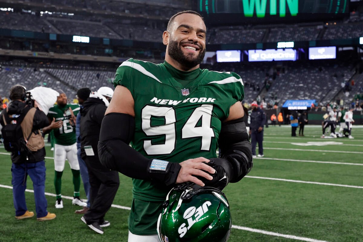 New York Jets defensive end Solomon Thomas, 94, smiles after an NFL football game against the Houston Texans on Sunday, Dec. 10, 2023, in East Rutherford, New Jersey.