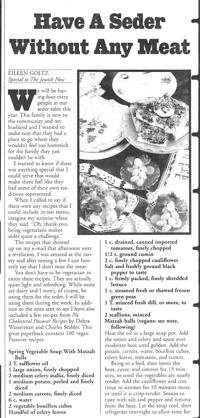 In the 1990s, another culinary era gained prominence. For example, see “Eat a Seder Without Meat” (March 18, 1999). Yes, indeed, this was an article with vegetarian Passover recipes. Certainly, spring vegetable soup with matzo balls looks delicious.