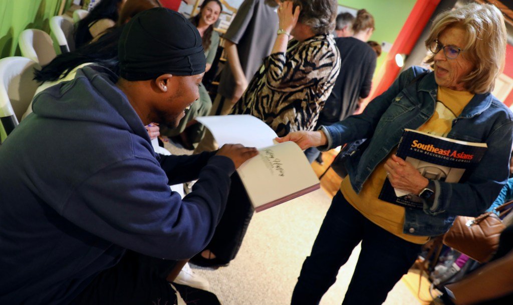 Emmanuel Sanchez, a Lowell High School student who immigrated to the United States from the Dominican Republic in 2019, signs a copy of “Tasting History” for local resident Carol Karstedt during a reading at LaLa Books on April 29. (Courtesy of Lowell Public Schools)