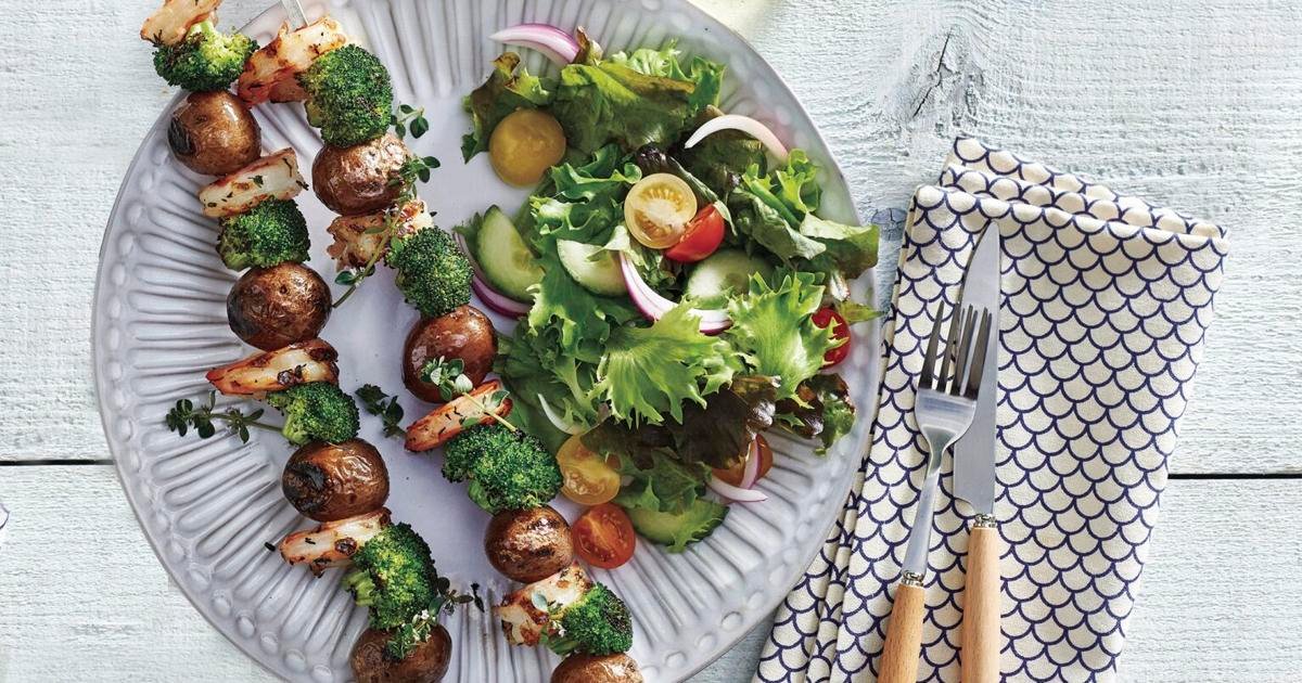For example, shrimp, broccoli, and potato skewers with lemon and thyme bring a little spring to your weeknight dinner. Skewers satisfy the whole family and are ready in less than 30 minutes, making them the perfect way to enjoy a quick and healthy meal without the fuss. Potatoes are so versatile that they can also be grilled. In this version, first he must be steamed in the microwave for 5 minutes to reduce grilling time.