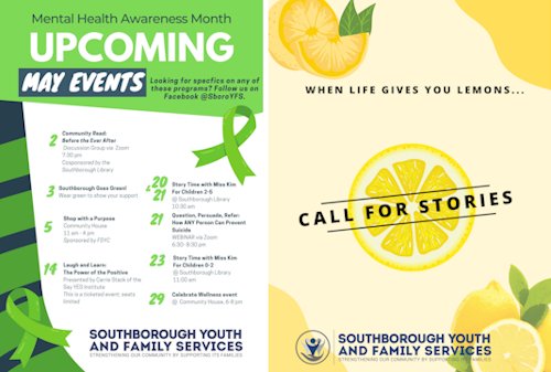 May is Mental Health Awareness Month (MHAM). Once again, Southborough Youth and Family Services is coordinating a series of special related events and is issuing a call for related one-page articles.