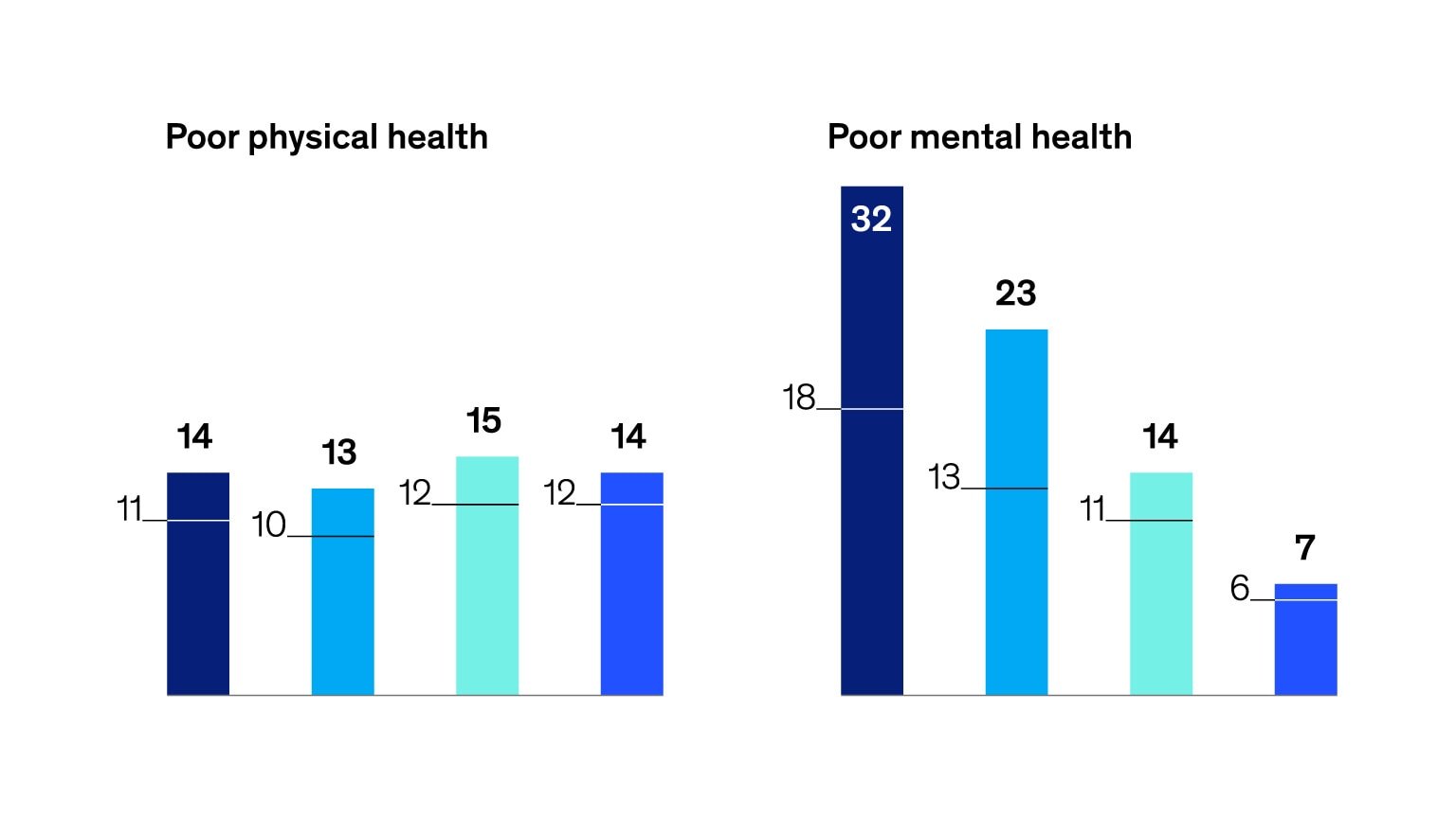 May 23, 2024Gen Z’s mental health is lagging behind other age groups. In a McKinsey Health Institute survey of more than 41,000 respondents across 26 countries, partner Erica Coe and her coauthors found that Gen Z overall reports more mental health challenges than non-Gen Zers. For example, Gen Z is three times more likely to report poor mental health than Baby Boomers. Because mental health (having a sense of purpose and connection to something bigger than yourself) overlaps with other aspects of overall health, insights into these aspects may lead to greater resilience.