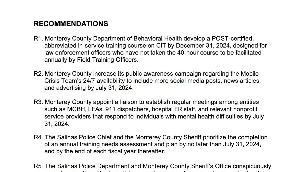 SALINAS, Calif. (KION) – A recent report from the Monterey County Civil Grand Jury found additional ways law enforcement and mental health services can better support people struggling with mental health.