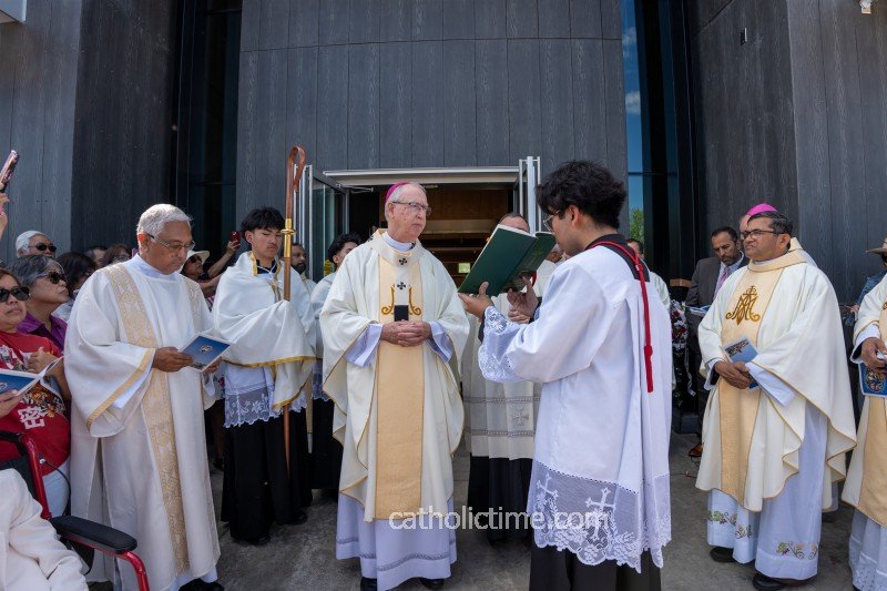 At 10:45 a.m., about 1,150 people gathered at the entrance to the chapel with Archbishop Richard Smith of Edmonton, Archbishop Gary Franken of St. Paul and more than 40 priests. Father Silvestre D’Souza, Bishop of Karnataka-Goa, cut the ribbon and opened the doors to the new spirituality centre. The archbishop greeted the crowd and recited an opening prayer. Then everyone entered the new chapel as the cathedral choir sang the entrance antiphon.