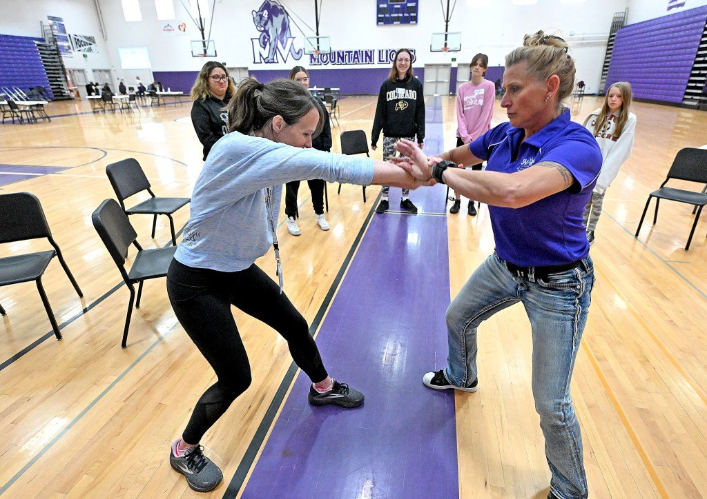 Friday’s retreat, held at a Mountain View gym, featured plenty of opportunities for both. Participants rotated through four stations throughout the day. Mental health workshops led by school social worker Raquel Castillo, self-defense demonstrations led by Loveland Police Department School Resource Officer Bobbie Jo Pastecki, and physical health led by Northern Women’s Clinic. It was a class. A collage-making session focused on Colorado and self-care.