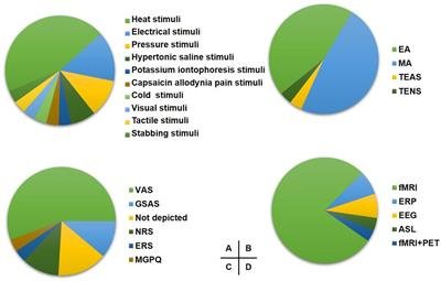 Figure 1. The study design of included studies. (A) The proportion of induced pain modality. (B) The proportion of acupuncture modality for experimental pain. (C) The proportion of pain assessment scale. (D) The proportion of imaging techniques. EA, electroacupuncture; MA, manual acupuncture; TEAS, transcutaneous electrical nerve stimulation; TENS, transcutaneous electrical nerve; VAS, visual analog scale; GSAS, gracely sensory and affective scales; NRS, numerical rating scale; ERS, expectations for relief scale; MGPQ, McGill pain questionnaire; fMRI, functional MRI; ERP, event-related potential.