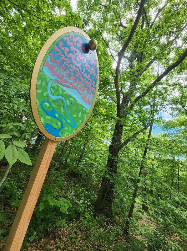 ROCKPORT — The sight of art and nature coexisting can be incredibly therapeutic. Surrounded by the trees, flowers, animals and beautiful scenery of Penobscot Bay, Pen Bay Medical Center is integrating with nature with 11 oval-shaped pendants installed along its 1.5-mile Wellness Trail. Each pendant, created by local artists Peter Walls and Allegra Kuhn, is 3 feet wide, 4 feet tall and mounted on a 12-foot pole, and is intended to draw attention to the charms of the surrounding landscape and enhance the healing environment.