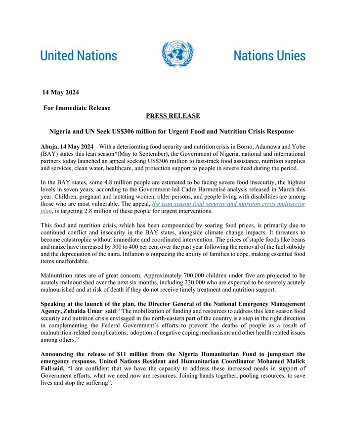 Abuja, May 14, 2024 – In response to this Leeds season* (May to September), where the food security and nutrition crisis in Borno, Adamawa and Yobe States (BAY) is worsening, the Nigerian government and domestic and international partners today announced We have launched an appeal seeking US$306 million to address the issue. Food assistance, nutritional supplies and services, clean water, medical care and protection assistance to people in critical need during this period.