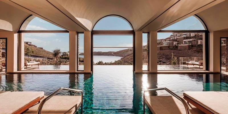 Designed by architect John Hee, the resort’s design pays homage to Kea’s architectural traditions and features hand-cut local stone, Greek marble, soaring atriums, whitewashed walls, pergolas and rounded arches.
