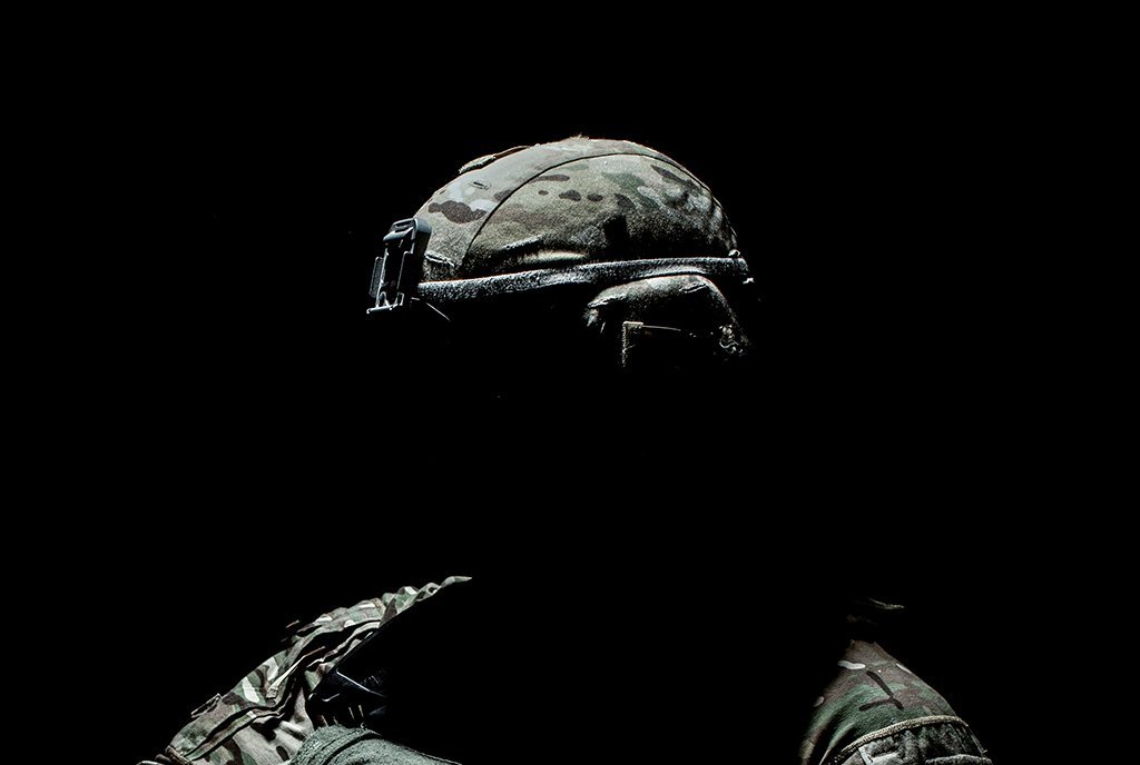 A darkly shadowed figure wearing military uniform stands in a dark room.