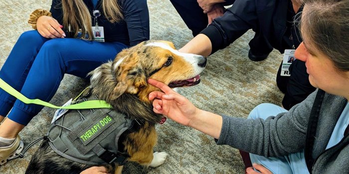 Parkview Health employees receive a visit from one of the “Parkview Pups.” The program brings certified therapy dogs into the workplace as a mood booster. Photo courtesy of Parkview Health.
